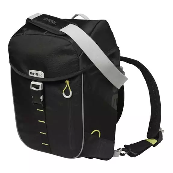 La borsa sportiva posteriore Basil Miles può essere posizionata in 4 modi diversi grazie ai manici rimovibili. Realizzata in poliestere idrorepellente IPX3. Con dettagli rifrangenti e spazio per aggiungere una luce led.