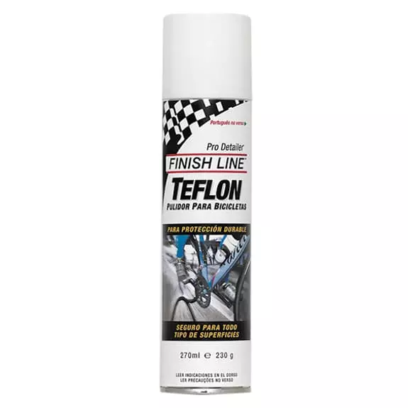 Detergente Finish Line Pro Detailer Teflon Aerosol con una nuova formula smaltata che ripara e ringiovanisce tutte le superfici e fornisce la brillantezza finale. Protegge dai raggi solari e dalla perdita di colore. Uno strato antiaderente previene il fissaggio di fango e sporco nel telaio, nei componenti e nella sella.
