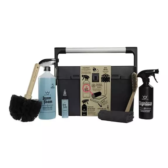 Il kit completo di pulizia Peaty’s Moq contiene i prodotti essenziali per la pulizia corretta della tua bici. Prodotti ecologici in un formato o imballaggio riciclabile. Questo kit contiene una bottiglia da un litro di detergente LoamFoam, 500 ml di sgrassatore per la trasmissione e un tubo da 120 ml di lubrificante per catene. Questi prodotti biodegradabili sono appositamente progettati per la pulizia della tua bici e sono dotati di un ugello spray. Il kit è confezionato in un cartone senza polimeri realizzato con il 70% di materiali riciclati. Stampato in nero per facilitare il riciclaggio.