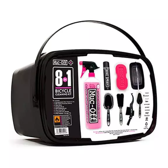 Il kit di pulizia Muc-Off 8 in 1 dispone del Nano Tech Bike Cleaner della marca, un set di spazzolini, una spugna, un Bike Spray e attrezzi sanitari.