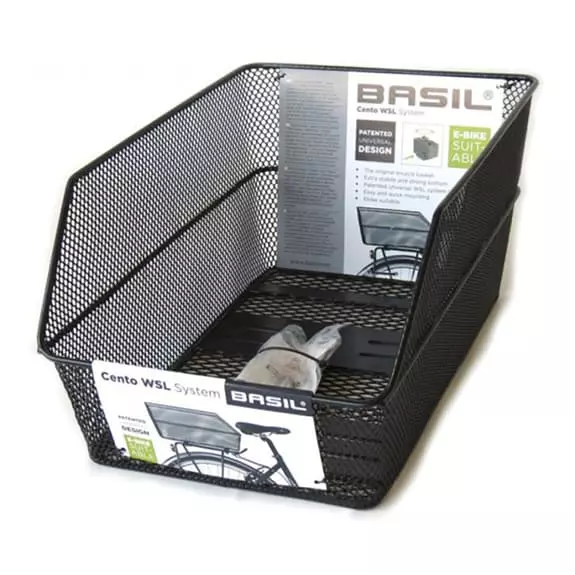 Il cestino posteriore Basil Cento si adatta alla maggior parte dei portapacchi e a tutti i tipi di biciclette, anche alle e-bikes a batteria posteriore grazie al sistema di sostegno WSL. È realizzato in rete di acciaio resistente.