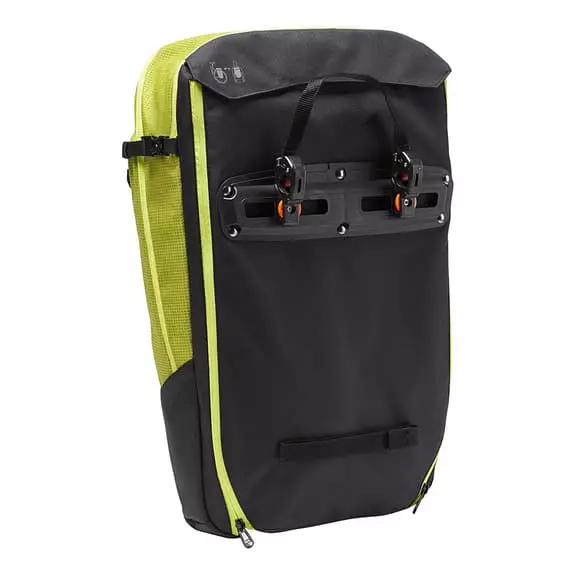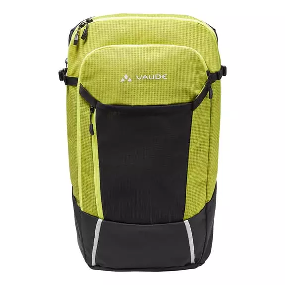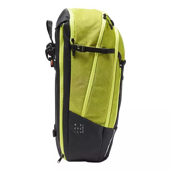 Lo zaino Vaude Cycle II Luminum, con una capacità di 28 litri, può essere utilizzato anche come borsa per chi desidera trasportare il proprio bagaglio durante il tragitto quotidiano in bicicletta. Si aggancia al portapacchi con i sistemi di attacco QMR che possono essere bloccati e riconvertiti rapidamente in uno zaino. Basta aprire le due cerniere verticali e l’intero sistema può essere riposto in uno scomparto con chiusura a velcro. Ha un ampio scomparto principale che può contenere documenti DIN A4, una bottiglia d’acqua, uno snack e un cambio di vestiti. Uno scomparto separato e imbottito con chiusura a zip può contenere computer portatili fino a 15,6 pollici. Lo scomparto anteriore a tutta lunghezza si apre in diagonale e offre un organizzatore in rete per il telefono, le chiavi e il portafoglio. Questo scomparto è dotato anche di una tasca piatta in rete per riporre rapidamente una rivista o i vestiti bagnati. Due cinghie di compressione laterali, un supporto per il casco e la copertura antipioggia inclusa completano le pratiche caratteristiche di questo zaino. Il materiale principale del Cycle II Luminum è costituito per il 50% da poliestere riciclato, mentre il materiale di contrasto è riciclato al 100%. Qualità Eco Finish 100% senza fluorocarburi. Questo prodotto è neutrale dal punto di vista climatico, poiché tutte le emissioni derivanti dai materiali, dalla produzione e dalla spedizione sono state sistematicamente analizzate da Vaude e ridotte. Le emissioni attualmente inevitabili sono state completamente compensate dall’organizzazione indipendente no-profit myclimate.