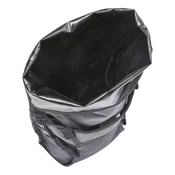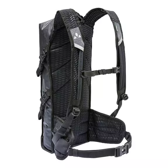 Lo zaino Vaude Trailpack II, con 8 litri di volume, è impermeabile e molto versatile, con una gamma illimitata di usi. È buono sia per il bikepacking che per il gravel, ed è perfetto come zaino per tutti i giorni. Lo scomparto principale è impermeabile al 100%, saldato e ha una chiusura roll-top. Si attacca nella parte inferiore della schiena e ai lati in modo che l’attrezzatura aggiuntiva o uno zaino idrico da 2L possano essere conservati nello spazio in alto. Dietro la patta anteriore, con due cinghie di compressione, c’è spazio per un casco, un gilet o altre attrezzature. Gli oggetti di valore possono essere conservati in modo sicuro nella piccola tasca con zip sul retro. Le stampe riflettenti sulla parte anteriore e sui lati dello zaino aumentano la visibilità in condizioni di scarsa luminosità. Sia lo scomparto principale impermeabile che la patta frontale sono realizzati con materiali riciclati al 100%. Il materiale riciclato del Trailpack II, certificato bluesign, è lavorato con il trattamento ecologico e idrorepellente Eco Finish senza l’uso di fluorocarburi (PFC).